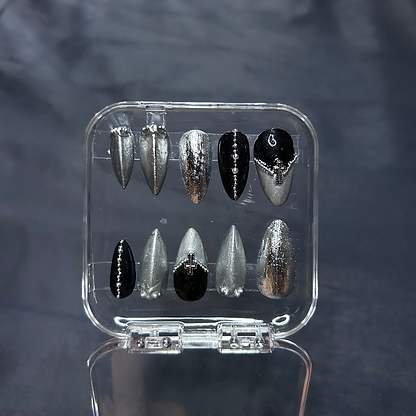 Крехката романтичност на розите се съчетава с металическия блясък на острие разкривайки двойнствеността на женската природа - нежност и сила. Това е изразено и във функционалността на сета, който комбинира къси и дълги нокти, за удобство и естетика.